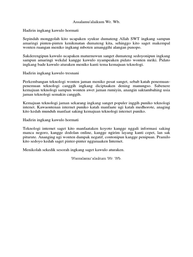 Atur salam taklim/kawilujengan rombongan pengiring calon manten 6. Ditambahkan identitas pembuat media, penggunaan bahasa ada isi media yaitu menggunakan bahaa ngoko dan ditambahkan pada bagian penutup media yaitu ucapan terima kasih. Mbok bilih anggen kula ngayahi jejibahan kathah atur saha patrap ingkang boten ndadosaken renaning penggalih, amargi cupeting seserepan kula ing rèh subasita, basa tuwin sastra. (rosyidi, afif abdul, basa jawa kangge kelas. Kata sesorah atau medhar sabda dalam bahasa indonesia berarti menyampaikan sebuah gagasan atau informasi dengan cara mengucapkannya di depan banyak orang untuk tujuan tertentu.